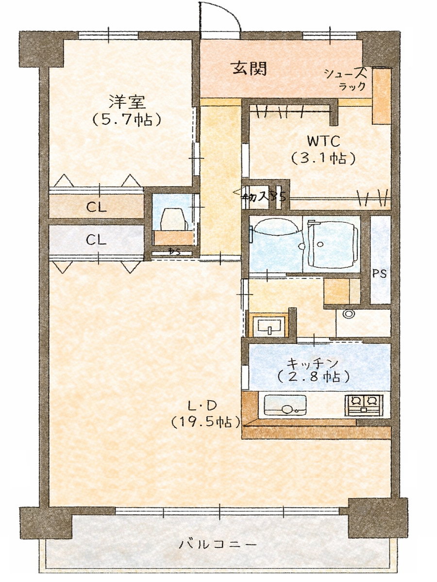 玄関からシューズクローク、ウォークスルークローゼット、廊下へと続く回遊動線が、日々の動きをスムーズに。収納スペースも充実しており、衣類や生活用品をすっきりと収められます。LDKは19.5帖の広々空間で、家族の時間をゆったりと包み込みます。